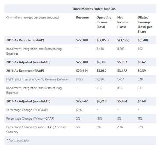 Un sabor agridulce para la compañía de Redmond, que cierra el año fiscal de 2016 con una facturación de 91.960 millones -con un descenso del 2% con respecto a 2015-, pero que en cambio ha visto cómo sus beneficios han aumentado un 38%, hasta los 16.798 millones de dólares. Con respecto al cuarto trimestre, el volumen de negocio se situó en 22.640 millones.