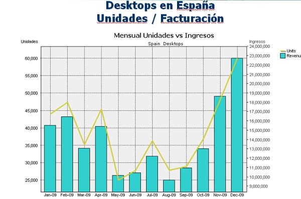 Hace mucho que el sobremesa se vio superado por el portátil. Sin embargo, este año el mercado de desktop estuvo cerca de la parálisis total en mayo y agosto, con ventas en torno a las 25.000 unidades mensuales, según los datos aportados por los mayoristas a la consultora Context. Ahora mismo, por cada tres o cuatro portátiles que se comercializan en el mercado español, sólo se vende un sobremesa. Cabe destacar, no obstante, la recuperación de este formato en la última parte del ejercicio, lo como consecuencia de la compaña de Navidad y de un cierto impulso de la demanda de las empresas, que han retrasado bastante la renovación del parque de PC. También ha favorecido las ventas Windows 7, que salió al mercado a finales de octubre.