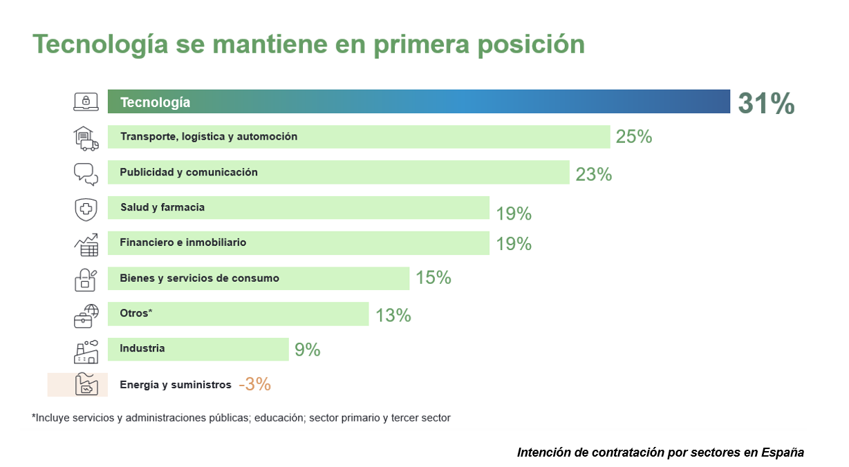 En el panorama internacional, las compañías tecnológicas también lideran las intenciones de contratación, con una previsión del 36%, lo que las sitúa 13 puntos por encima del promedio global (23%). Le siguen transporte, logística y automoción, con un 24%, y con empate en 20% están los sectores de bienes y servicios, energía y salud y farmacia.