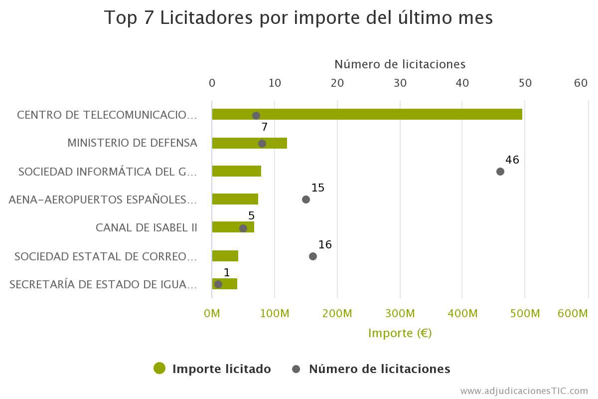 Por otra parte, entre las instituciones públicas que han licitado proyectos de mayor importe en el mes de agosto, y que aún no han adjudicado, se encuentran el Centro de Comunicaciones y Tecnologías de la Información de la Generalitat de Cataluña, con siete licitaciones por un importe de 496.734.201 euros; el Ministerio de Defensa, que ha licitado ocho proyectos por un importe de 121.313.585 euros; Sociedad Informática del Gobierno Vasco (EJIE) con 46 licitaciones por un importe de 79.088.551 euros; Aena, con 15 licitaciones por un importe de 75.477.268 euros; Canal de Isabel II con cinco licitaciones por un importe de 69.055.666 euros; Sociedad Estatal de Correos y Telégrafos con 16 licitaciones por un importe de 42.416.792 euros; y por último, la Secretaría de Estado de Igualdad y contra la Vilencia de Género, con una licitación por valor de 40.590.793 euros.