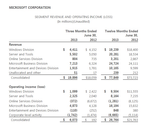 Microsoft ha cerrado su ejercicio fiscal de 2013 con unos resultados bastante satisfactorios. Ha logrado incrementar un 5,3% sus ingresos con respecto a 2012 al facturar un total de 77.849 millones de dólares; y el beneficio neto ha pasado de 16.978 millones el año pasado a 21.863 millones de dólares este año.