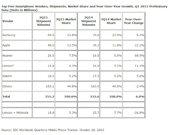 Por fabricantes, Samsung sigue de líder, con 84,5 millones de smartphones comercializados en el trimestre, un 6,1% más que el año pasado. La apuesta clara del fabricante coreano están siendo los dispositivos de gama alta, como el Galaxy S6 edge y el Note5. En los mercados emergentes, la mayor parte de las ventas fueron de aparatos por debajo de los 200 dólares, como el Galaxy Core o el Grand Prime.