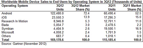 Las ventas a nivel mundial de teléfonos móviles para usuario final alcanzaron cerca de 428 millones de unidades en el tercer trimestre de 2012, lo que representa una bajada del 3,1% frente al mismo trimestre de 2011, de acuerdo con Gartner. Los smartphone representaron un 39,6% del total de ventas, incrementándose en un 46,9%.