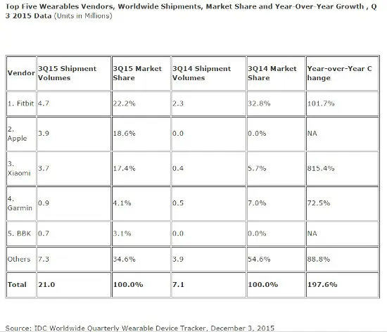 Por fabricantes, Fitbit fue el que más unidades de producto puso en el mercado. En concreto, vendió 4,7 millones de pulseras para medir la actividad física. Le siguió Apple, con unas ventas de 3,9 millones de relojes, y Xioami, que se aupó al tercer puesto, con 3,7 millones de dispositivos. Más atrás, y a mucha distancia, quedaron Garmin (0,9 millones) y XTC (0,7 millones). Curiosamente, Samsung ha sido desplazado del top5 mundial.