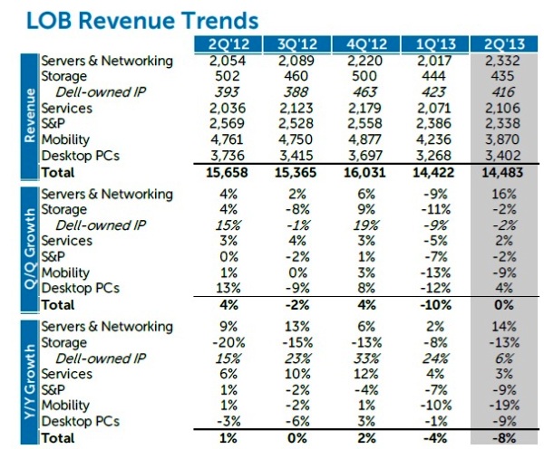 «Nuestro rendimiento en el segundo trimestre ha proporcionado una prueba más de que nuestra estrategia a largo plazo es correcta”,ha comentado Brian Gladden, director financiero de Dell, en un comunicado. “Continuamos nuestro progreso en el cambio de la mezcla de nuestro negocio de soluciones empresariales de mayor margen, dirigida por un sólido crecimiento en nuestro negocio de servidores, redes, servicios y almacenamiento IP”.