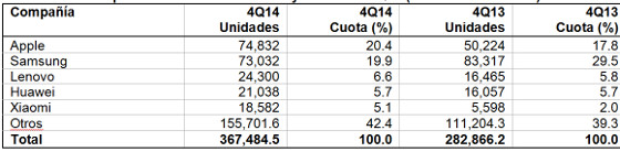 Las ventas mundiales de smartphones crecieron un 29,9% en el último trimestre de 2014 gracias a los 367,5 millones de unidades comercializadas. En este periodo, Apple desbancó a Samsung de la primera posición, un puesto que mantenía desde 2011.
