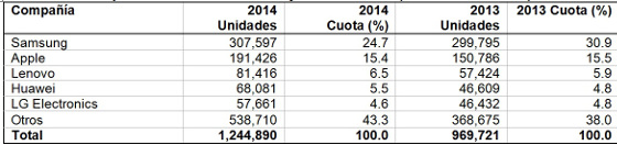 Analizando estos resultados por fabricante, hay que destacar que Apple registró su mejor trimestre precisamente en el último de 2014 con 74,8 millones de terminales vendidos y la primera posición en el mercado global de smartphones. Sus teléfonos de amplia pantalla continúan dominando la demanda tanto en China como en Estados unidos, países en los que obtuvo un ascenso del 56% y el 88%, respectivamente. Los nuevos iPhone 6 e iPhone 6 Plus captaron tanto a nuevos como a viejos clientes de la manzana.