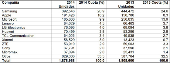Lenovo, cuyos resultados incluyen también las ventas de Motorola -la fusión de ambas compañías se completó el 30 de octubre de 2014-, se situó en la tercera posición en el cuarto trimestre con un 6,6% de cuota y un crecimiento del 47,6%