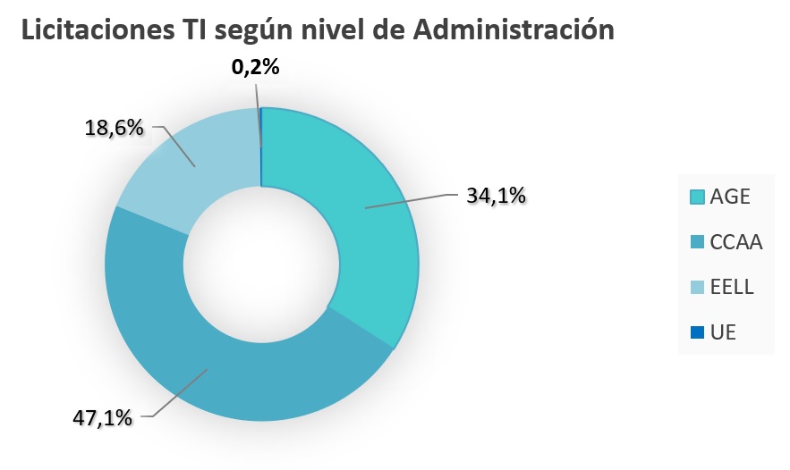 En cuanto a la distribución de las licitaciones TI por nivel de Administración, los datos del primer semestre de 2020 revelan que las comunidades autónomas (CCAA) son las que más licitan, con 514,6 millones de euros, un 16% más que el primer semestre de 2019. Les sigue la Administración General del Estado (AGE), que licita 372,8 millones de euros, un 19% menos que en 2019; las entidades locales (EELL), con 203,9 millones de euros, un 23% más que en 2019; y las instituciones comunitarias (IICC), con 2,2 millones de euros. Es decir, el 47,1% de las licitaciones TI corresponde a las Comunidades Autónomas, seguido por el 34,1% de la Administración General del Estado y del 18,6% de las entidades locales. Por su parte, las instituciones comunitarias suponen únicamente el 0,2 % del total.