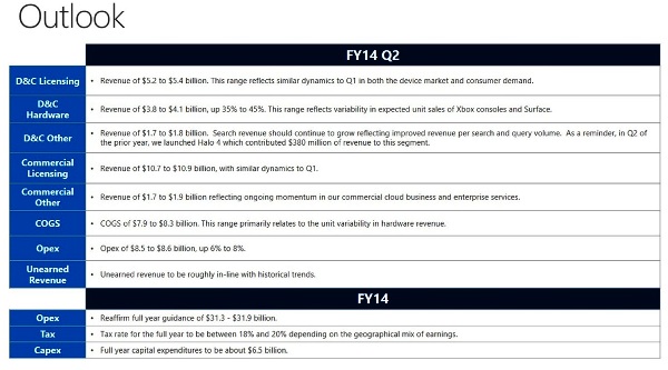 La valoración de estas cifras por parte de Steve Ballmer, todavía CEO de Microsoft hasta que se encuentre un sustituto, es que los nuevos servicios comerciales de la compañía «nos ayudarán a crecer aún más en el mercado empresarial”, y añade que han observado bastante entusiasmo entre los consumidores para Xbox One, Surface y los dispositivos con Windows 8.1.