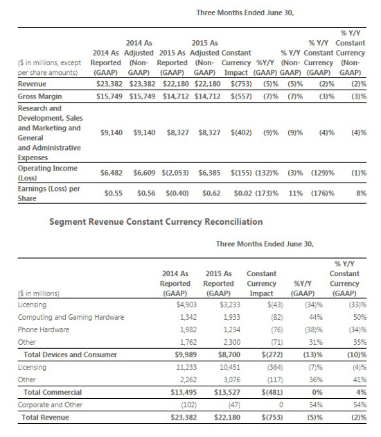 En concreto, el gigante del software perdió entre abril y junio (último trimestre de su ejercicio fiscal) casi 2.200 millones de dólares, frente a unos beneficios de 4.610 millones en el mismo periodo del año anterior. En términos de ingresos, la caída fue del 5,1%. Microsoft vendió tecnología y servicios por valor de 22.180 millones de dólares, por los 23.380 millones del ejercicio anterior. Si no se tiene en cuenta la apreciación de la moneda estadounidense, ese descenso sería sólo del 2%.