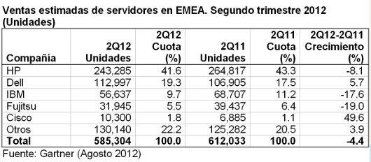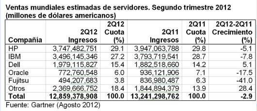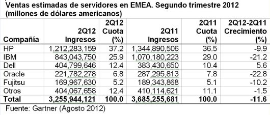 En cuanto a fabricantes, HP lidera el ranking tanto en unidades (a pesar de haber visto caer sus ventas un 5,6% frente al mismo periodo de 2011, consecuencia de los descensos en sus ProLiant), como en facturación (3.700 millones).