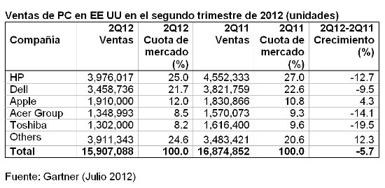 En el segundo trimestre del año se vendieron 87,5 millones de PC en todo el mundo, lo que supone un 0,1% menos de unidades comercializadas en comparación con el mismo periodo de 2011. Esta apatía de la industria (que lleva siete trimestres consecutivos de atonía total) se ha salvado en EMEA, Asia/Pacífico y Japón que registraron, según Gartner, un escueto crecimiento frente al declive del mercado americano.