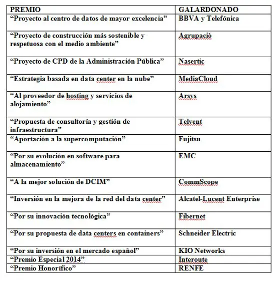 En esta edición, los Premios constaban de quince categorías, entre las que cabe destacar el “Proyecto al Centro de Datos de Mayor Excelencia”, otorgado ex aequo a BBVA y Telefónica, por ser los dos únicos centros de datos en Europa que han obtenido la certificación Tier IV Gold del Uptime Institute, recordemos que se trata de un sello que tan sólo han conseguido cinco data center a nivel mundial (dos en Estados Unidos, uno en Canadá y el BBVA y Telefónica en Madrid).