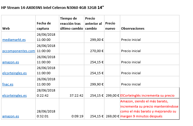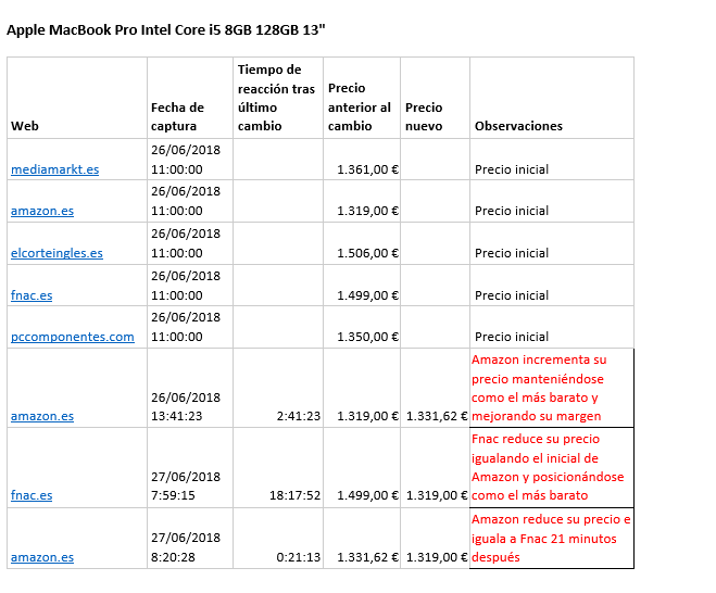 Respecto a las horas del día en las que se producen los cambios (el estudio se realizó entre las 11 horas del 26 de junio y las 11 horas del 28 de junio), Amazon es el único que modifica sus precios a cualquier hora, a diferencia de sus competidores que los realizan en una o dos ventanas al día. Esta mayor flexibilidad le permite a Amazon reaccionar en “tiempo real» a los cambios de precio de sus competidores, siendo el tiempo mínimo detectado de 6 minutos y 36 segundos tras un cambio en MediaMarkt.