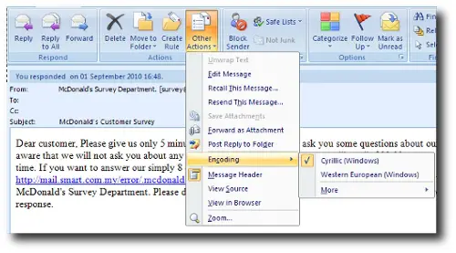 El correo malicioso se presenta bajo el asunto Encuesta a clientes de McDonald´s (McDonald´s Customer Survey) pero no es más que una nueva campaña de phising que avanza a marchas forzadas por la Red. Presuntamente se trata de un mail enviado por la propia cadena de restaurantes de comida rápida en el que se plantea una serie de preguntas a los usuarios sobre los productos de esta firma. Una vez completado el cuestionario se solicitan una serie de datos personales entre los que se incluye el número de tarjeta de crédito y código de seguridad a cambio de recibir un pago de 90 dólares como compensación por haber respondido a la encuesta.