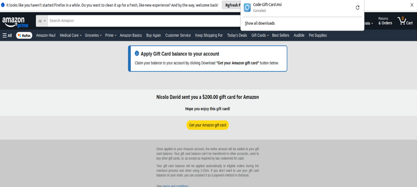 El riesgo no se limita solo al robo del saldo. Durante estas fechas, los ciberdelincuentes también intensifican sus campañas en marketplaces, aprovechando el aumento de búsquedas de ofertas y promociones de última hora. Kaspersky ha identificado, por ejemplo, una web fraudulenta que imitaba a Amazon y ofrecía una tarjeta regalo de 200 dólares como gancho. Al hacer clic en el botón para obtenerla, el usuario descargaba un archivo que instalaba una puerta trasera en el dispositivo, permitiendo a los atacantes tomar el control remoto del sistema.