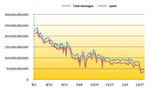 Symantec ha estado monitorizando la fuerte caída del correo basura durante los últimos meses. Según sus datos, los mensajes de spam y phishing representaron el 81,69% de todos los mensajes de diciembre, comparado con el 84,31% de noviembre. Mientras que el phishing tuvo un descenso generalizado (en todos los sectores) del 15% en dicho periodo, el spam mundial lo hizo en un 19,98%.