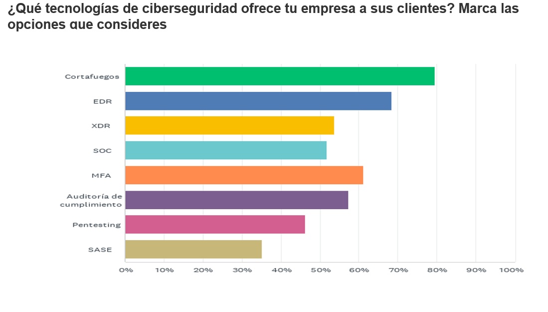 Pero lo primero es perfilar a los encuestados. Más de la mitad de los partners que responden a las preguntas son empresas de cierto tamaño (más de 100 empleados). Y en cuanto al tipo de clientes que atienden, están muy repartidos entre pymes, grandes cuentas y Administración pública. Es decir, son partners que “atacan” a todo el mercado. Entre las tecnologías que más ofrecen esos partners a sus clientes están el cortafuegos, las soluciones EDR y MFA, las auditorías de cumplimiento normativo y los servicios desde un SOC.