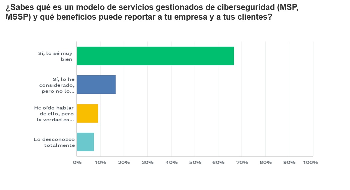 Pero los datos más interesantes llegan en la parte donde preguntamos a los partners directamente por su conocimiento y expectativas sobre el modelo MSP. Así, la inmensa mayoría de los revendedores de ciberseguridad consultados asegura conocer muy bien el modelo de servicios gestionados. Casi un 67% señala que sabe muy bien qué es y qué beneficios reporta. Y tan solo un 7,4% admite que “lo desconoce totalmente”.