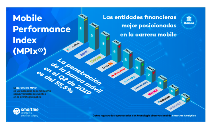 El uso de la banca móvil en el segundo trimestre del año se situó en el 55,5 por ciento de la población española, un 0,7 por ciento menos que en el trimestre anterior, según el MPIx, Mobile Performance Index. El índice, elaborado por la compañía de tecnología observacional Smartme Analytics, monitorizaen tiempo real el uso de más de 90 aplicaciones financieras para elaborar trimestralmente un ranking con las mejores aplicaciones bancarias según su rendimiento. Para su elaboración utiliza un algoritmo que permite identificar las entidades mejor posicionadas en base a variantes como: cuota de mercado, tiempo de uso al día o por sesión, valoración en los stores, e incluso penetración en grupos determinantes como los Millennials y la Generación Z.