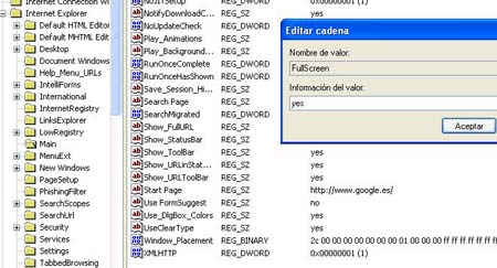 Empezaremos por abrir el editor mediante el comando Regedit. Seguidamente accedemos a la ruta HKEY_CURRENT_USER /Software/ Microsoft / Internet Explorer/ Main. En este último apartado hay una clave que indica FullScreen, bastará con cambiar su valor interno haciendo doble clic sobre ella para introducir el valor Yes.