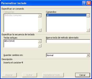 Pongamos que tienes que trabajar en un teclado que carece de ñ o que no utiliza símbolos tan necesarios para el correo electrónico como son la arroba (@) o para otros menesteres como los corchetes ([ ]). Como medida preliminar podemos acceder a las opción Insertar/símbolo, seleccionar con el ratón aquél que precisamos y pulsar sobre el botón Aceptar. Para no tener que realizar esta opción a mano cada vez que necesitemos el citado símbolo, lo mejor será que la asignemos a una tecla.